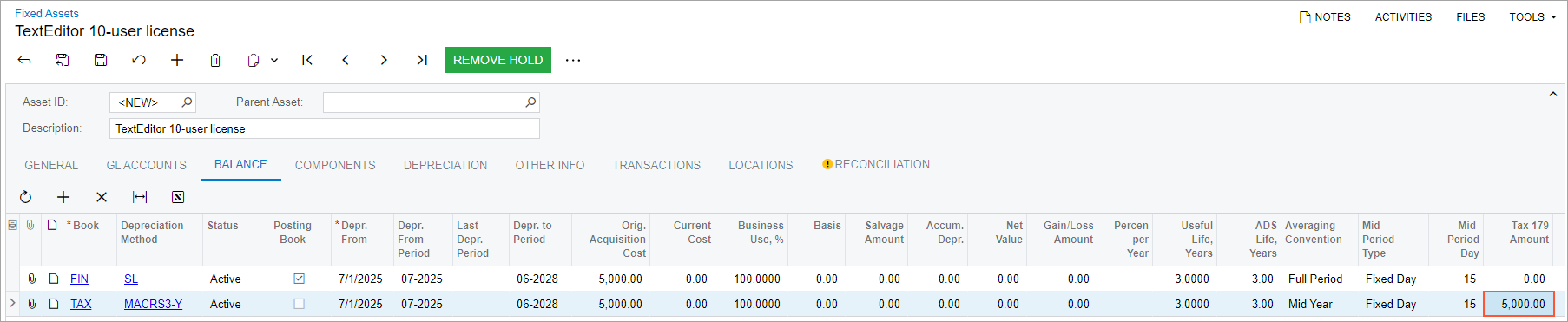 The depreciation for the FIN book is calculated by the usual rule because you have not selected the Sect. 179 check box for this book in the settings of the SOFTWARE class.