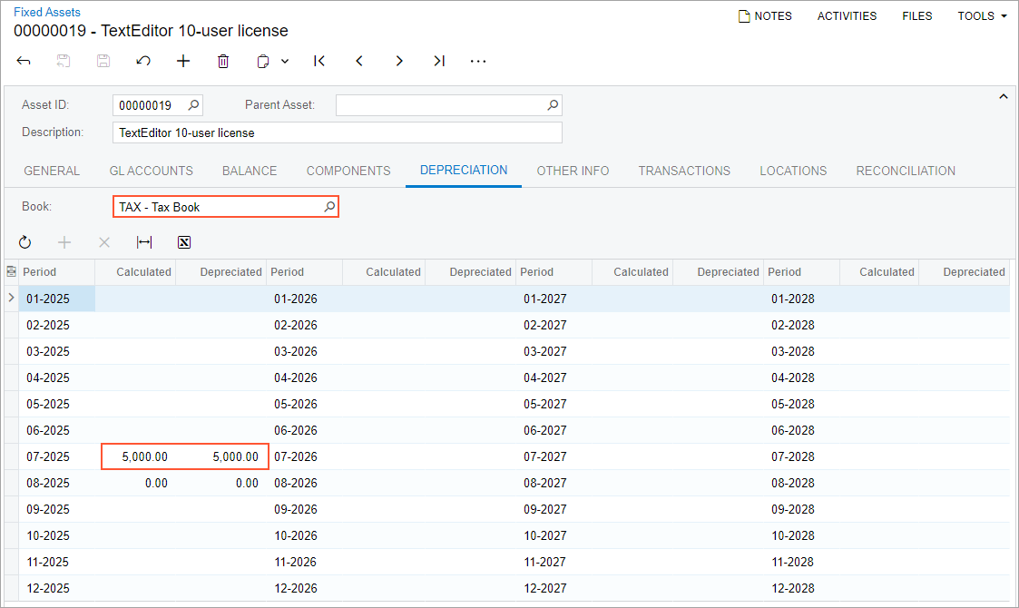 Figure 2. Depreciation calculated for 07-2025 for the TAX book