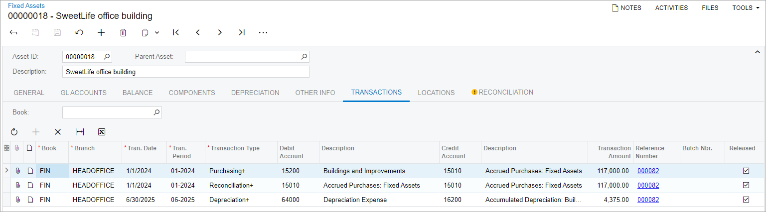 The system has generated the Purchasing+ and Depreciation+ transactions to register the asset's acquisition cost and the accumulated depreciation amount, and the Reconciliation+ transaction to set the unreconciled cost to 0. Although the transactions are marked as released, they do not update the general ledger, so the Batch Nbr. column is empty.
