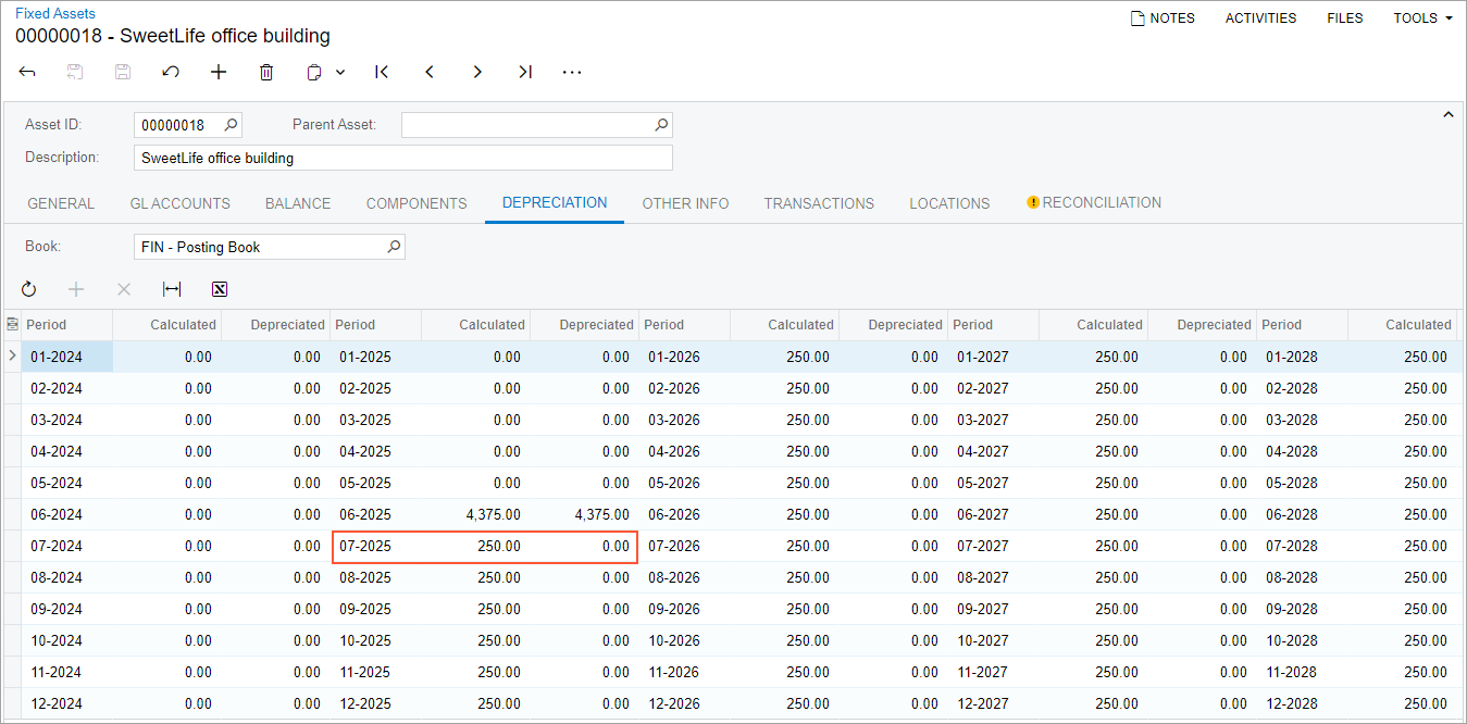 For the periods listed before the current period, in the Depreciated column, the system shows the depreciation amounts that have been recorded to the Accumulated Depreciation account for the asset: $0.00 for the periods through 05-2025, and $4,375 for the last depreciation period (06-2025). For the current period (07-2025), in the Calculated column, the system shows the calculated depreciation plus the calculated depreciation adjustment. Because the calculated depreciation amount ($4,375) is equal to the entered accumulated depreciation, no adjustment is needed for the asset in 07-2025. For the periods after the current period, in the Calculated column, the system shows the depreciation amounts calculated according to the settings of the asset. If no changes to the asset's cost are made, when the asset is depreciated, these amounts will be posted to the Accumulated Depreciation account.
