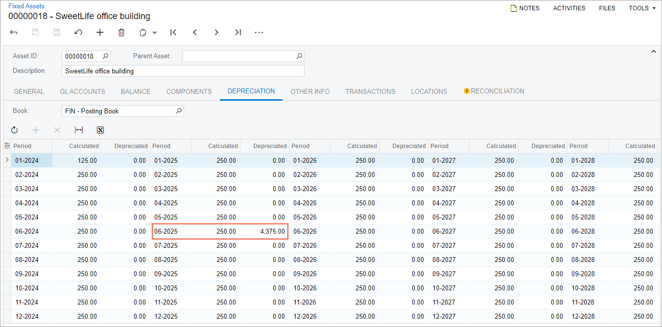 The Calculated column displays the calculated depreciation amounts for the periods. The total calculated depreciation for the periods from 01-2024 through 06-2025 is $4,375 ($125 + $250 * 17). The Depreciated column shows the recorded depreciation amounts. For the periods from 01-2024 through 06-2025, the recorded depreciation is $0.00. The accumulated depreciation that you have entered ($4,375) is recorded to the last depreciation period (06-2025).