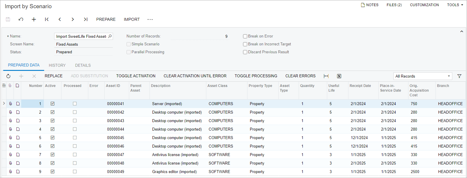 - On the form toolbar, click Import. The system processes the records and creates the fixed assets. The processed records have the Processed check boxes selected on the Prepared Data tab.