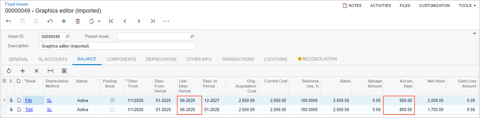- Finally, you will run the FA Balance (FA630000) report and review one of the imported assets on the Fixed Assets (FA303000) form.