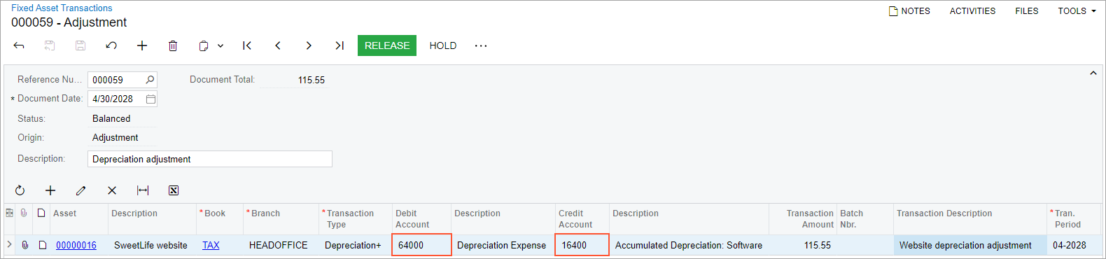 In this activity, you will create an AP bill on the Bills and Adjustments (AP301000) form and convert this purchase on the Convert Purchases to Assets (FA504500) form. On the Fixed Assets form, you will calculate depreciation for the SweetLife website asset. On the Calculate Depreciation (FA502000) form, you will recalculate depreciation for the fixed asset. Finally, on the Fixed Asset Transactions (FA301000) form, you will create and release a depreciation adjustment transaction.