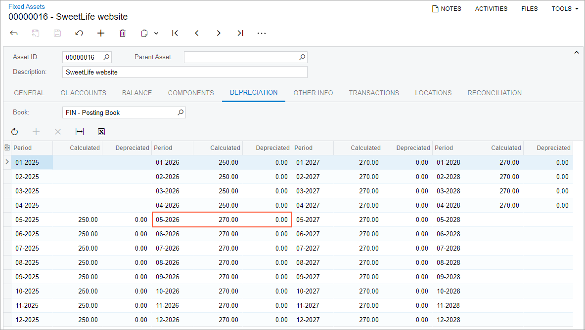 - Before the addition is made, the system calculates depreciation based on the cost of the original asset. For the SweetLife website asset for the periods before the addition (from 05-2025 through 04-2026), the calculated depreciation in the FIN book is $250 ($9000 / 36).