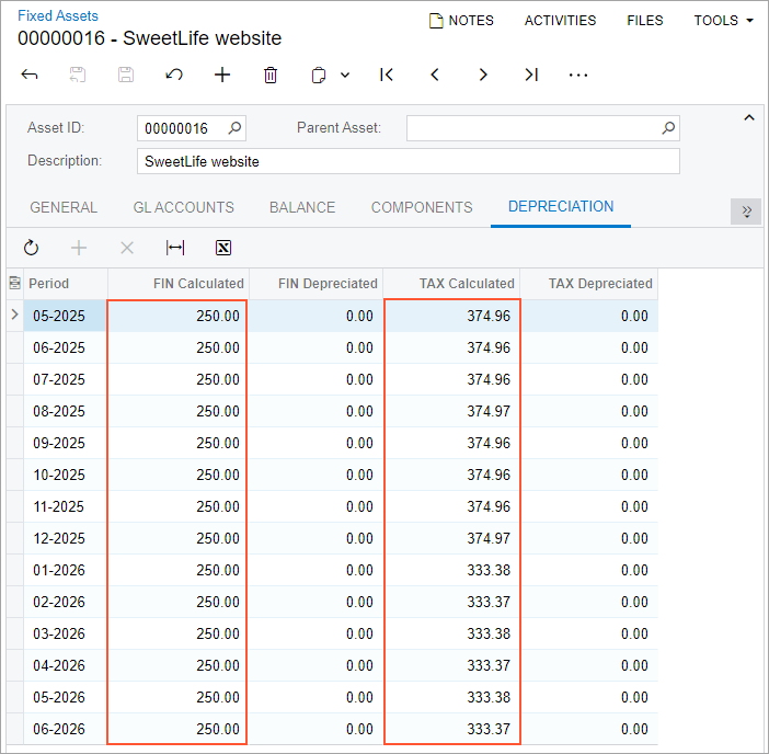 The FIN Calculated column displays the depreciation that was calculated for the FIN book. Because the book uses the straight-line method, the system spreads the amount of $9,000 across 36 months (3 years)—that is, the depreciation expense for each month is $250 ($9,000 / 36 = $250). The TAX Calculated column displays the depreciation that was calculated for the TAX book. The system uses a different method of calculating depreciation for the TAX book (MACRS3-Y), so the depreciation expenses differ from those calculated for the FIN book.
