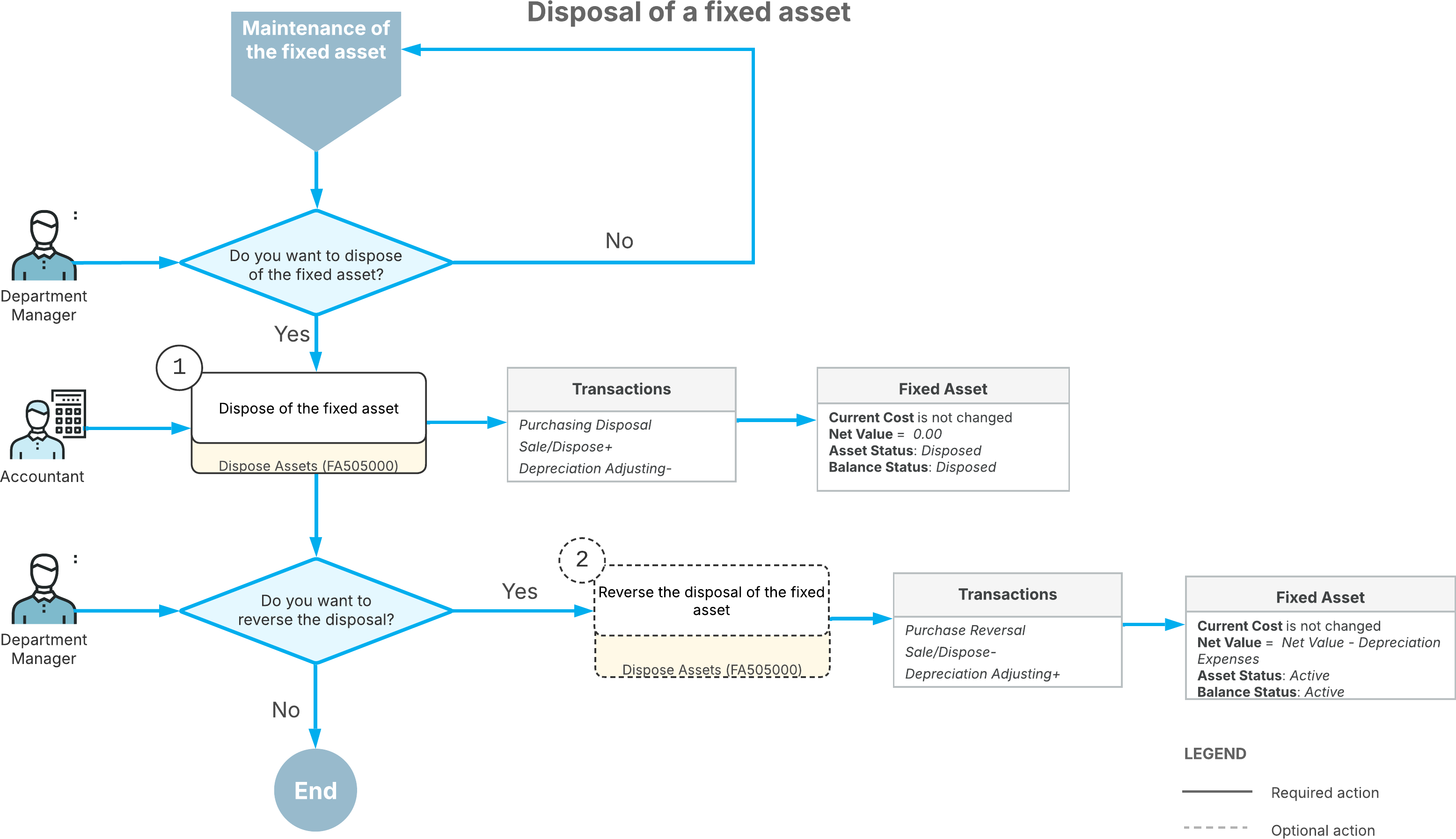 As the diagram shows, the disposal of a fixed asset involves these steps: