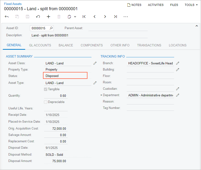 - On the Fixed Assets (FA303000) form, open the Land - split from 00000001 fixed asset that has the current cost of $72,000.