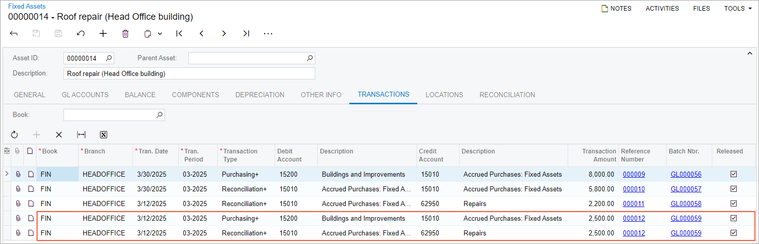 - On the Fixed Assets (FA303000) form, open the Roof repair (Head Office building) asset.