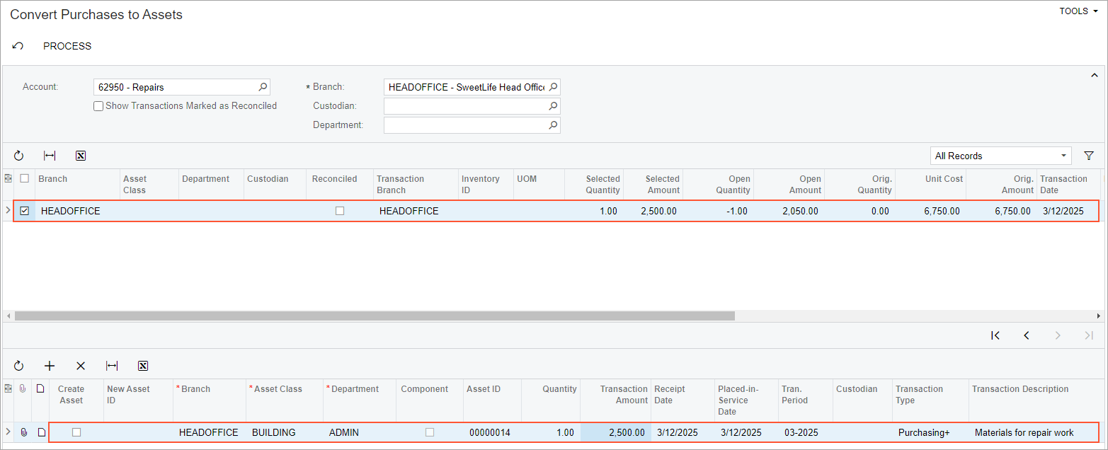 - Click Process on the form toolbar to add the cost of these materials to the asset.