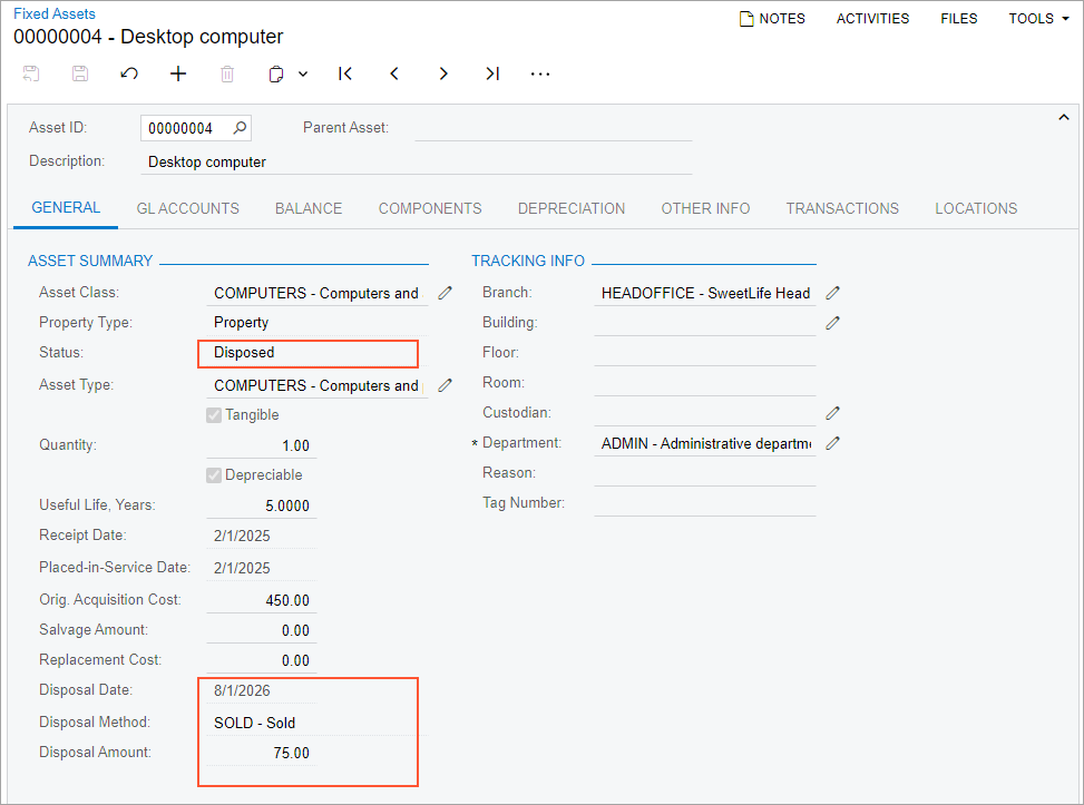 In this activity, you will dispose of the fixed asset on the Dispose Assets (FA505000) form. On the Fixed Assets (FA303000) form, you will review the settings of the disposed asset and the generated transactions. Finally, on the Invoices and Memos (AR301000) form, you will create an AR invoice to record the sale of this fixed asset.