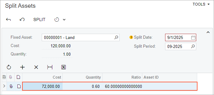 - On the More menu (under Processing), click Split. The system opens the Split Assets (FA506000) form with the Land asset selected.