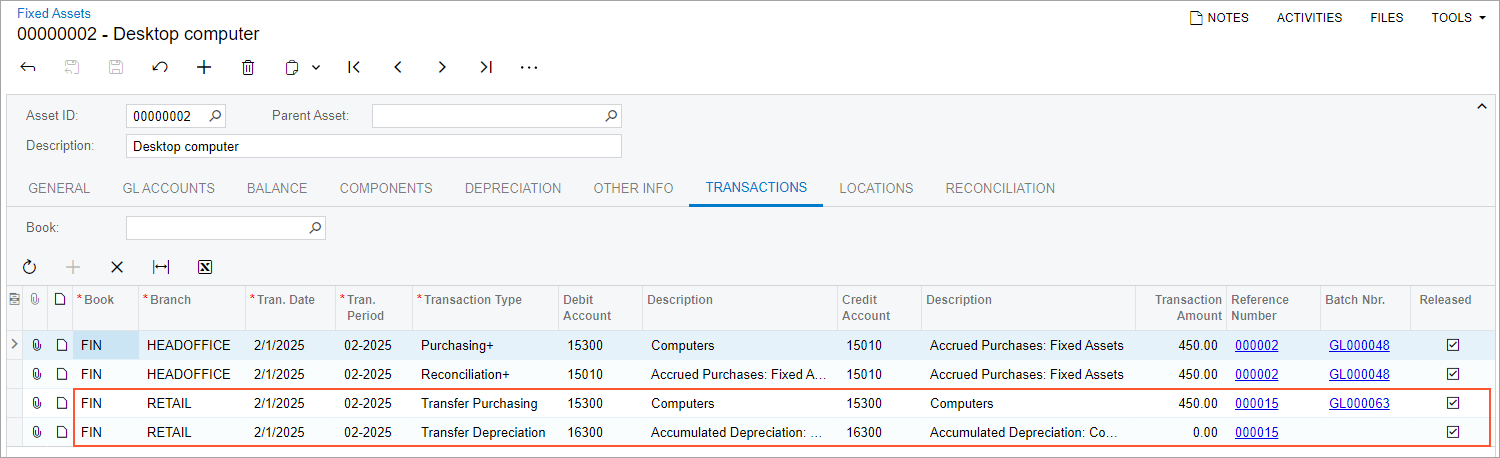 - On the Fixed Assets (FA303000) form, open one of the Desktop computer assets.