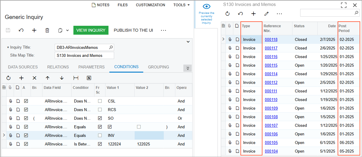 Suppose that you are a technical specialist in your company who is working on simple customizations, including those involving the creation, modification, and use of generic inquiries. An accountant of your company has requested an inquiry form that displays data about invoices. You have offered the predefined Invoices and Memos (AR3010PL) generic inquiry form, but the accountant wants the inquiry form to show results limited to a range of financial periods that the accountant wants to analyze. Specifically, the inquiry form should display only invoices (that is, no other document types) posted from the 12-2024 financial period through the 01-2025 financial period (including the starting and ending periods).
