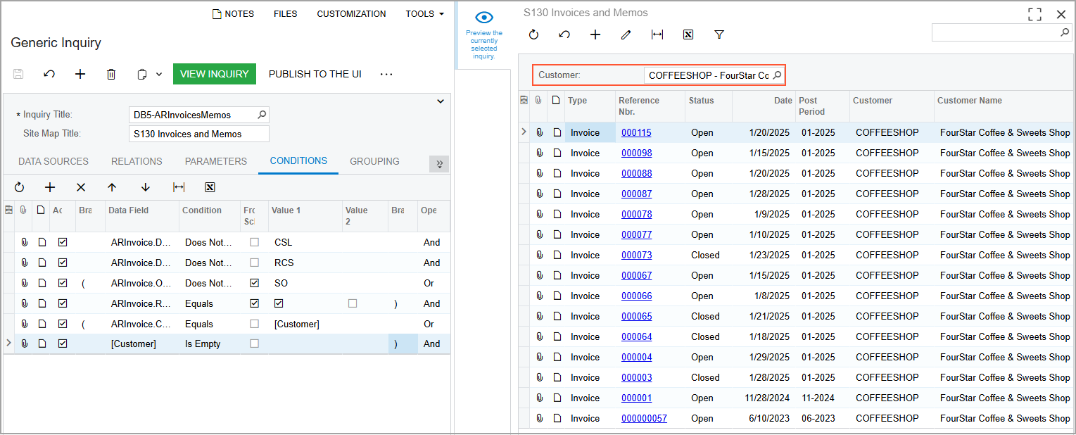 On the Results Grid tab of the Generic Inquiry (SM208000) form for the copied inquiry, you will look for the row that corresponds to the Customer column of the inquiry and note the value in the Data Field column. You will add the Customer parameter on the Parameters tab. Then you will specify how the system should apply the value of the parameter to the inquiry output by adding a condition on the Conditions tab.