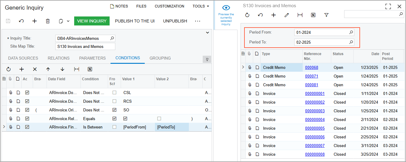 On the Results Grid tab of the Generic Inquiry (SM208000) form for the copied inquiry, you will look for the row that corresponds to the Post Period column of the inquiry and note the value in the Data Field column. You will add two parameters (Period From and Period To) on the Parameters tab. Then you will specify how the system should apply the values of these parameters to the inquiry results by adding a condition on the Conditions tab.