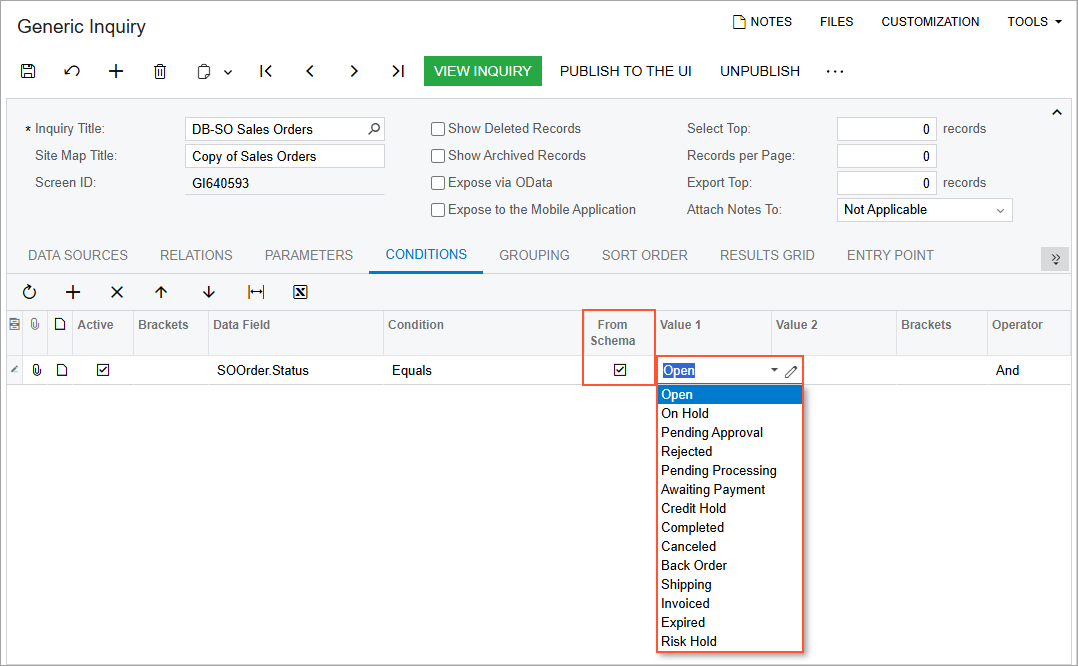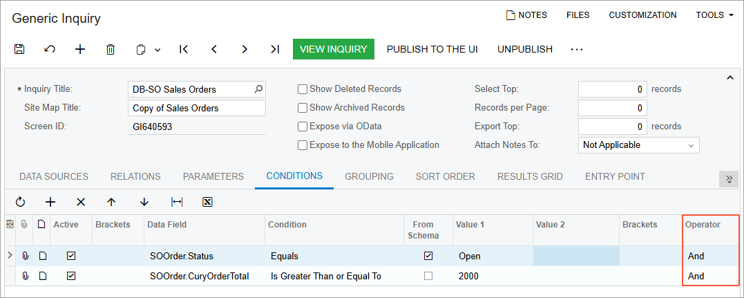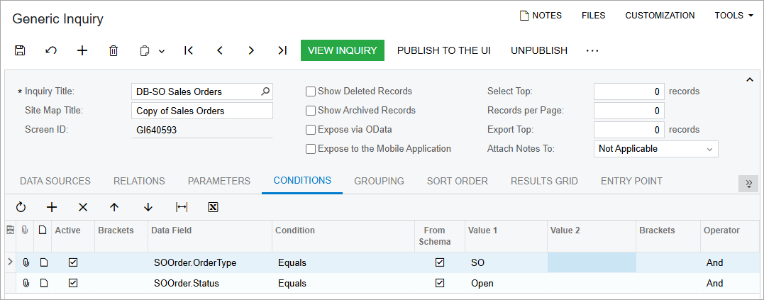 You can limit the data to be displayed in the results of a generic inquiry by adding conditions to the inquiry on the Conditions tab of the Generic Inquiry (SM208000) form. For example, suppose that you are designing or modifying an inquiry that lists open sales orders that have been created on the Sales Orders (SO301000) form. To do this, you will define the following conditions that must be met for inquiry results to be listed: The order type equals SO, and the order status equals Open.