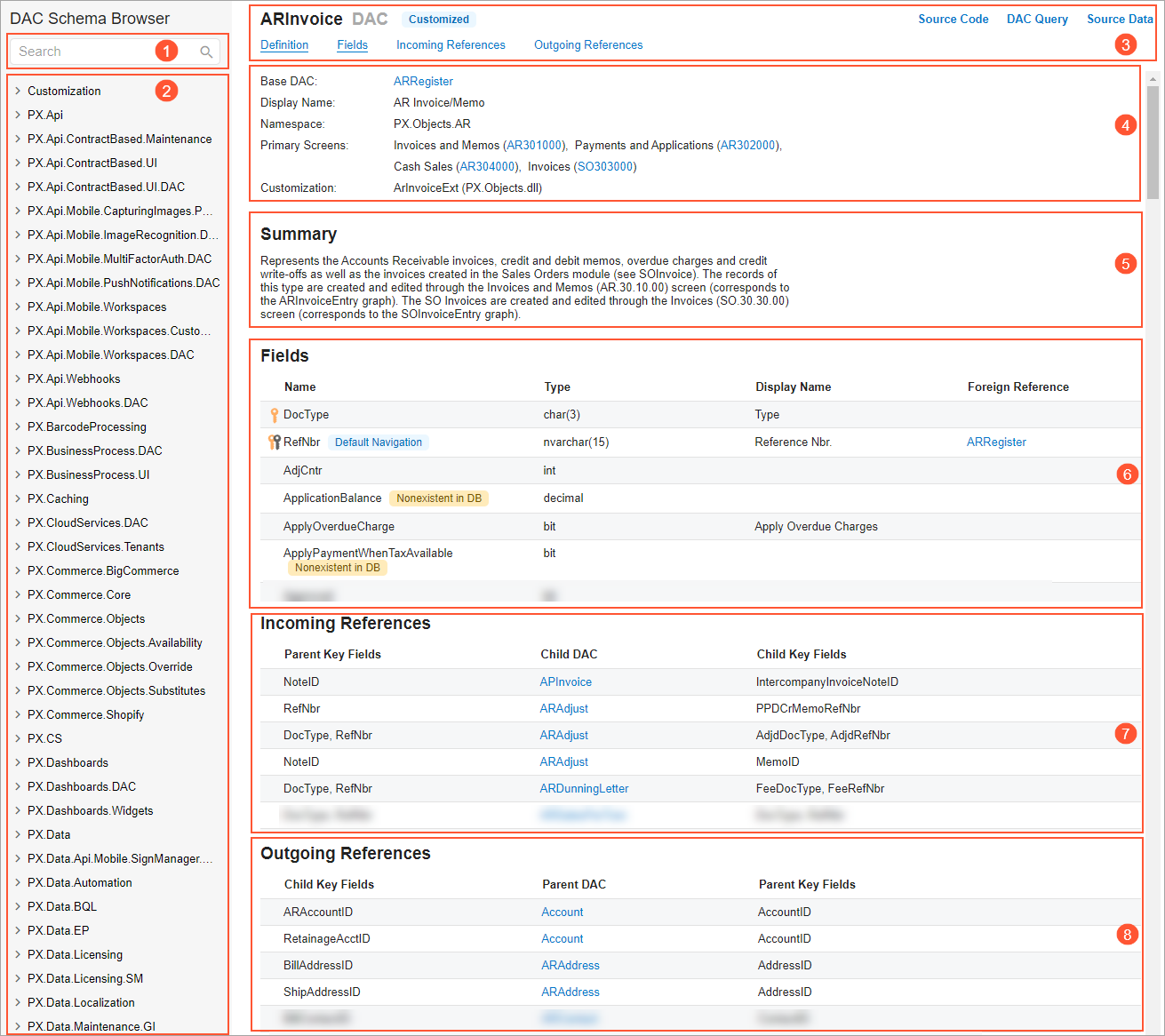 - Main information area (Item 4): In this part, you can obtain additional information about the selected DAC, such as the following: a link to the base DAC (that is, the DAC through which the system receives data); a link to a DAC that is used in a projection query or in a nested DAC; the list of forms whose primary view is based on the selected DAC (applicable only for primary DACs); and a link to the parent DAC (if applicable) of the selected DAC.