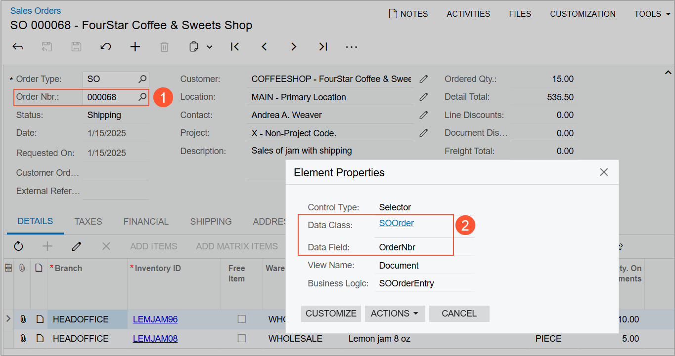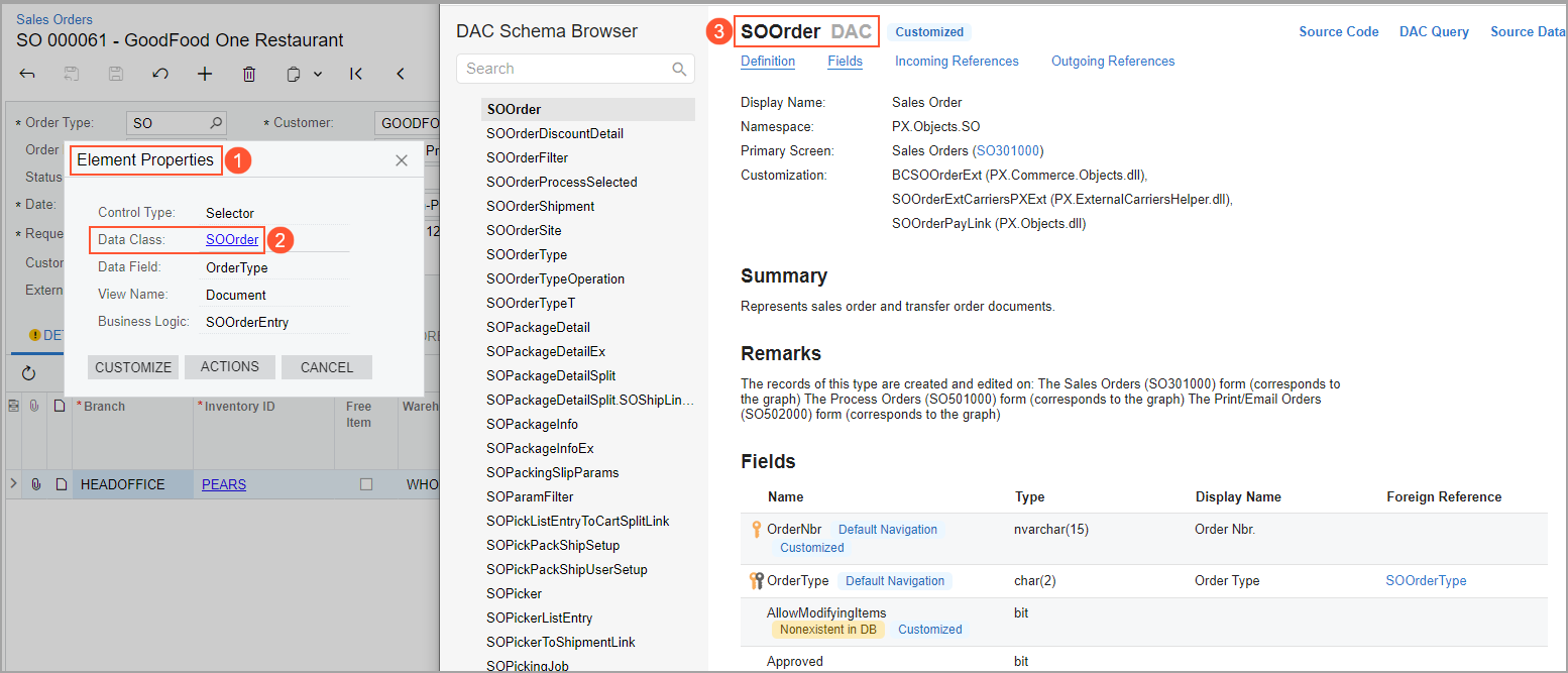 To find the underlying data access classes and fields, you explore the forms related to the needed data. For example, suppose that you want to find the data field that holds the reference number of a sales order. When you save a sales order on the Sales Orders (SO301000) form, the system assigns a reference number to it. To find out which data class and data field correspond to the sales order reference number, you open this form, press Ctrl+Alt and click the Order Nbr. element on the form (see Item 1 in the screenshot below).