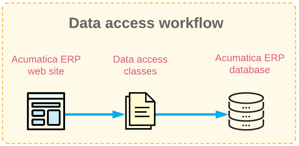 In MYOB Acumatica, the data is stored in a database. However, users of MYOB Acumatica do not access the database directly. Instead, they access the data access classes (DACs), as shown in the illustration below. A data access class is a programming object used to represent and provide access to a database table in the code of MYOB Acumatica.