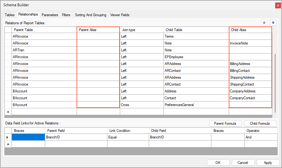 In the MYOB Acumatica Report Designer, you can specify aliases (if needed) on the Relationships tab of the Schema Builder. The following screenshot shows the aliases specified for some tables on the Relationships tab of the Schema Builder.
