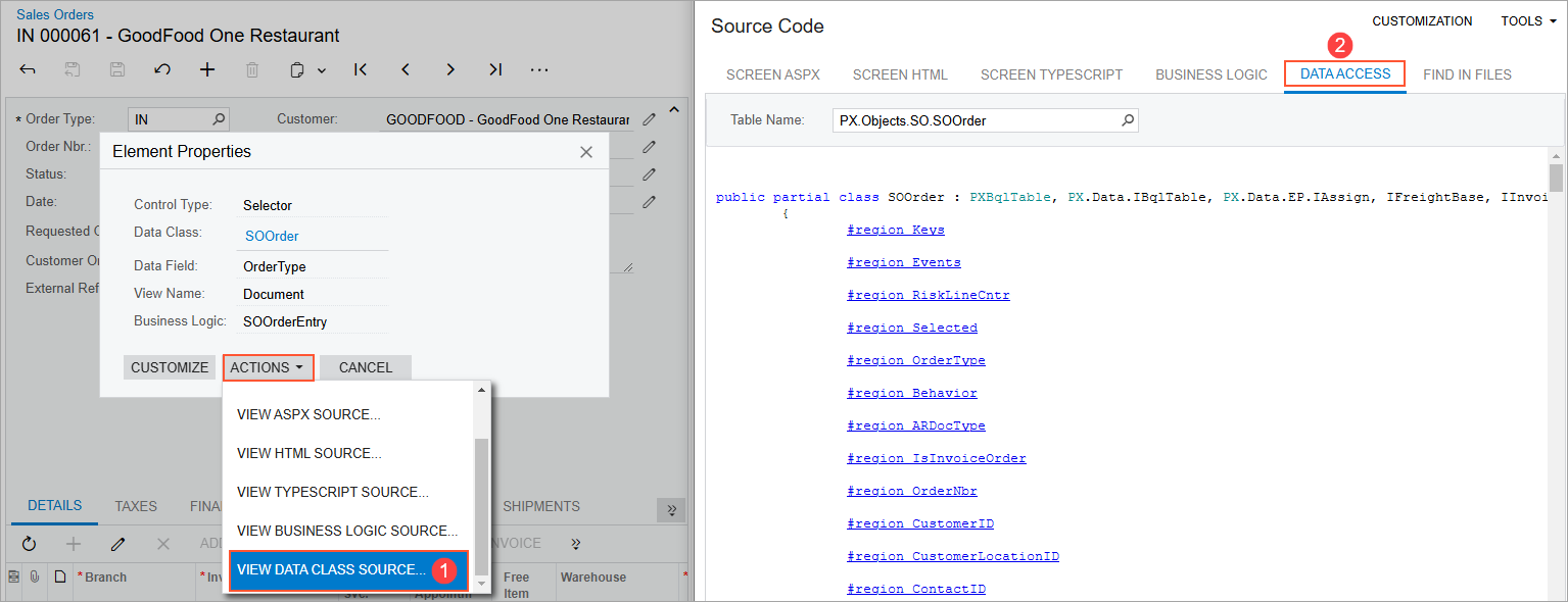 Also, you can click [1]does not work https://jira.acumatica.com/browse/AC-289145djk_tv1_cdc2023/11/2215:10:07+01:00The bug is not fixed but the Actions menu opens as expected in 2024R2.1djk_tv1_cdc12024/10/1818:35:28+02:00 in the dialog box (see Item 1 in the following screenshot). The system opens the Source Code (SM204570) form in a pop-up window with the details of the data access class (Item 2).