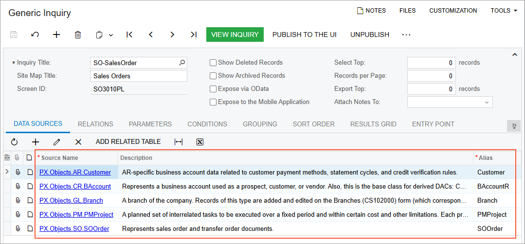 The following screenshot shows the list of data access classes and their aliases for the SO-SalesOrder generic inquiry (with the Sales Orders site map title).