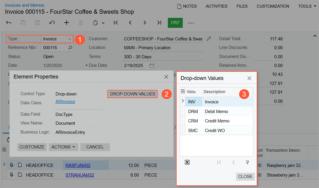 If you are inspecting an element with a drop-down control (see Item 1 in the following screenshot), you can also view the list of values for the element. To do this, in the Element Properties dialog box, you click the Drop-Down Values button (Item 2) and the system displays the Drop-Down Values dialog box (Item 3). In the dialog box, you can review the list of options available for the drop-down control. The Value column lists the values stored in the database, and the Description column lists the corresponding captions that are displayed on the user interface. You use the values from the Value column in complex conditions and in formulas in generic inquiries and reports.