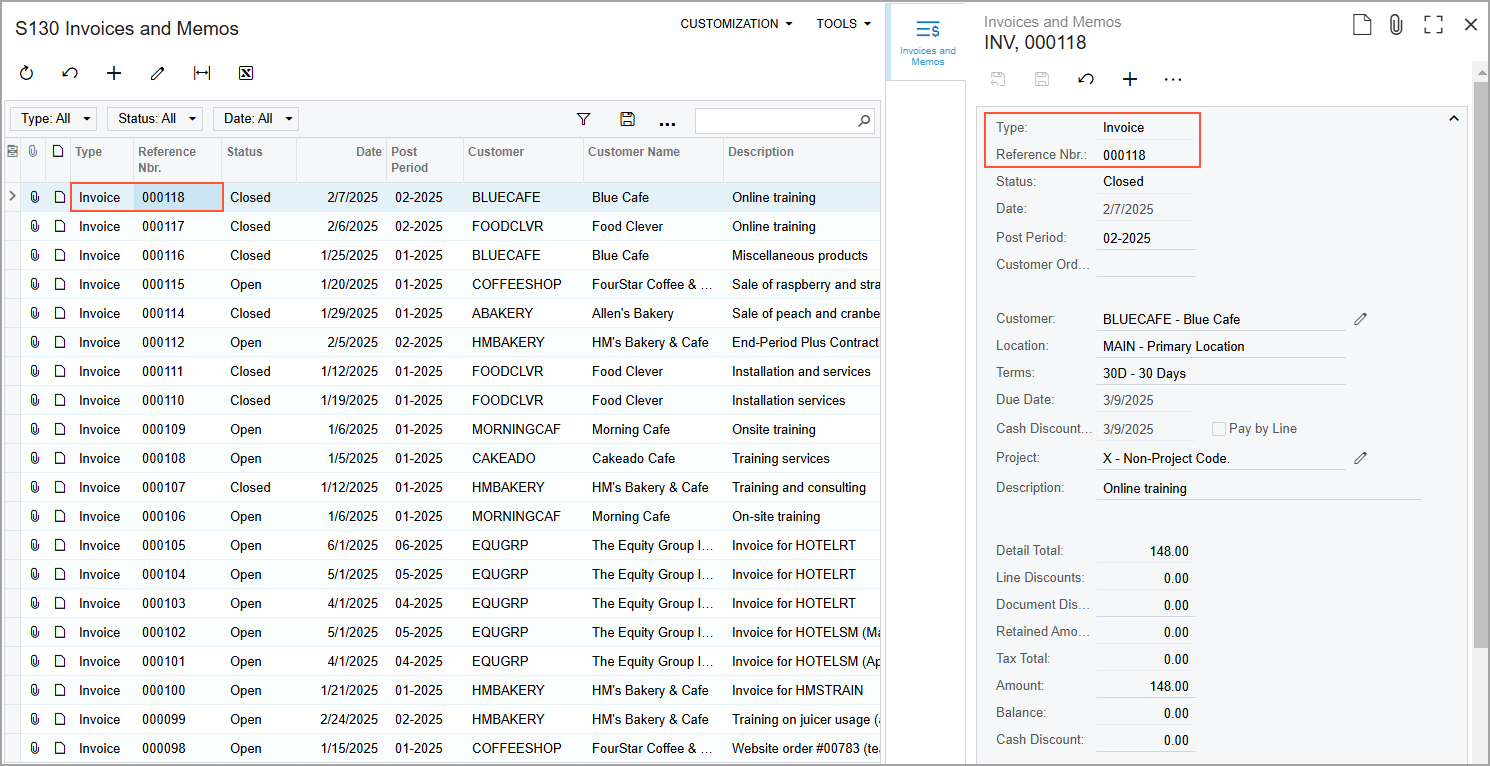- Click a row with an invoice or memo, and notice that the system displays its