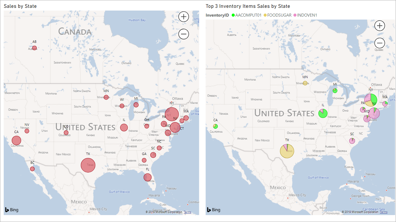 Microsoft Power BI offers advanced capabilities for creating charts. You can expose a generic inquiry’s results through OData and access the data from Power BI. By using Power BI, you can create advanced charts based on data imported from MYOB Acumatica. An advanced Power BI chart can then be imported back to MYOB Acumatica and added to a dashboard as a widget. For example, you can create a visual display of your sales across the United States (as shown in the following screenshot). Due to the exposure of the inquiry results through OData, the Power BI chart displays real-time data when you view it either in Power BI or on your dashboard in MYOB Acumatica.