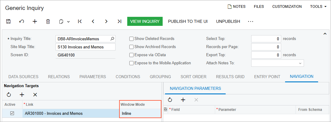 When you replace a primary form with an inquiry form, the system automatically adds the corresponding navigation settings for this inquiry on the Navigation tab. It also sets the Window Mode for the path to the Inline option (as shown in the following screenshot), which is not available for selection by users.