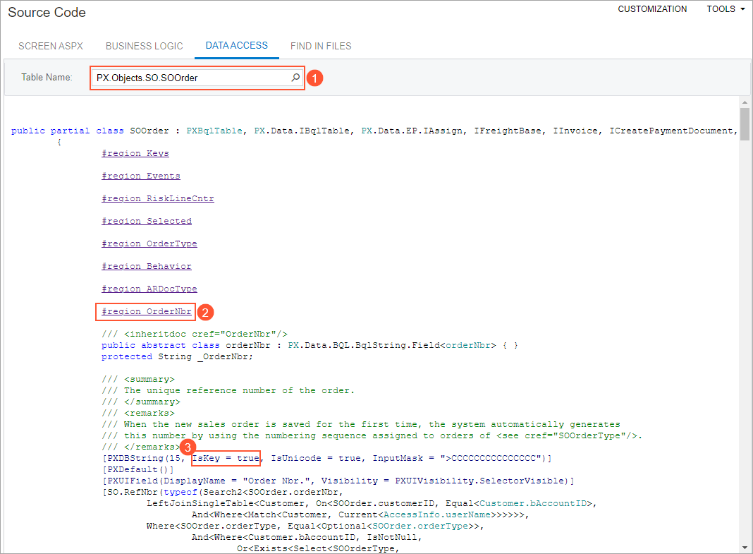 The information about each key field—the field in the applicable record that holds unique data identifying that record from all the other records in the database—of the data access class you need is stored in the source code. You can get more information about the data access class you need on the Source Code (SM204570) form, which you can access in the following ways: