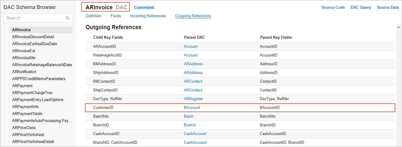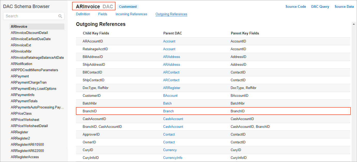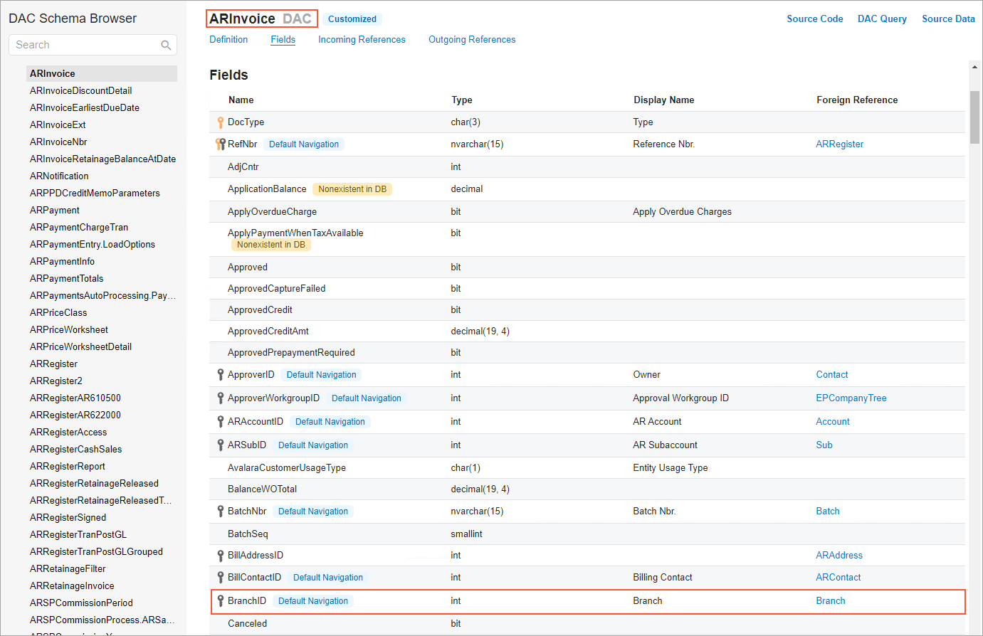 In the DAC Schema Browser, in the Name column of the Fields table, you look for the fields that hold information about the branch and customer of an AR invoice. These fields are BranchID and CustomerID, which are foreign keys, which means that there are DACs that reference these fields (listed in the Foreign Reference column, as shown in the following screenshot).