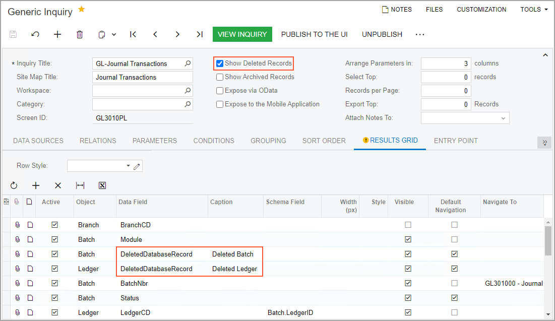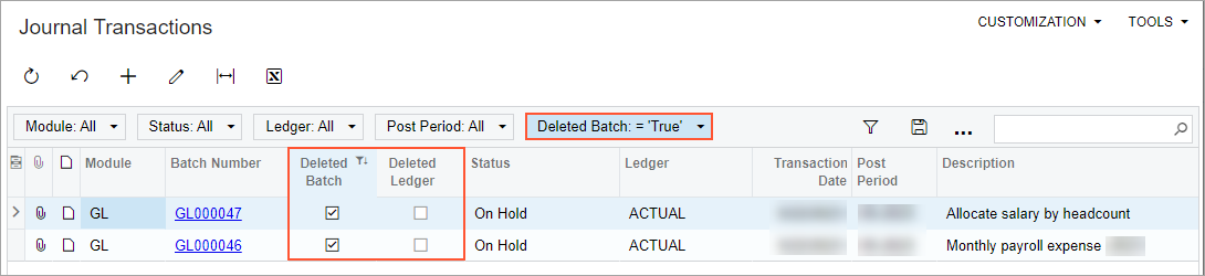 The following screenshot shows the Journal Transactions generic inquiry, in which the records of deleted batches and ledgers are now included. Newly added columns can be used for filtering records.
