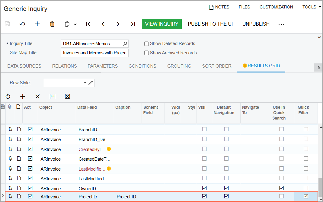 - While you are still viewing the Generic Inquiry (SM208000) form with the DB1-ARInvoicesMemos generic inquiry selected, again open the Results Grid tab.