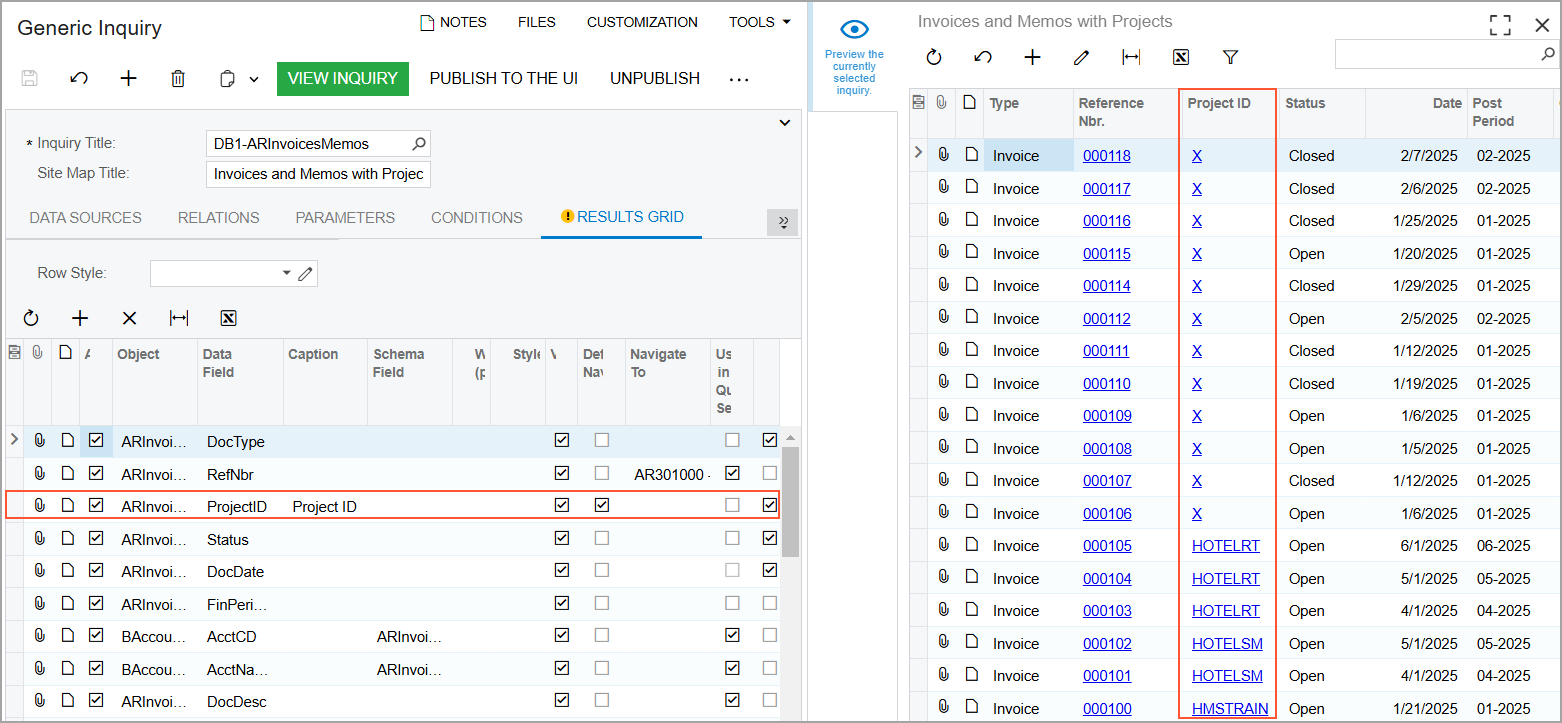 - Add the identifier of the related project (that is, the project related to the listed invoice) to the inquiry results in the column with the Project ID caption