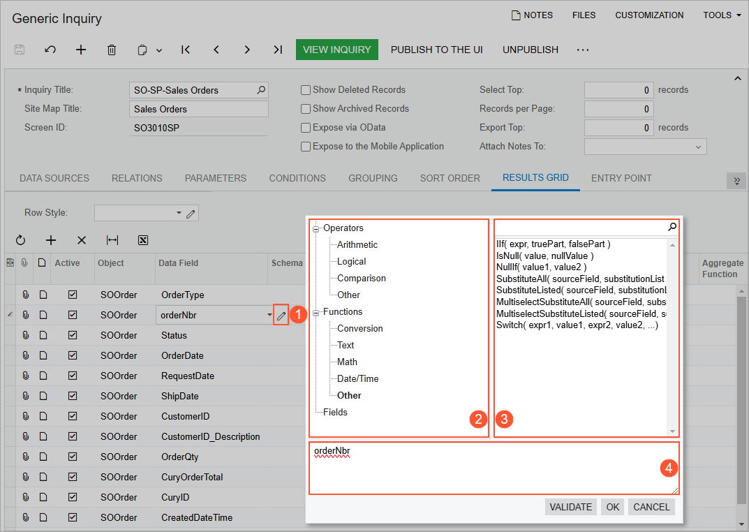 On the Results Grid tab of the Generic Inquiry (SM208000) form, each row represents a column in the resulting inquiry form. To specify a formula that determines the value in a column of the resulting inquiry form, you use the Formula Editor dialog box. To invoke the dialog box, you click a cell in the column of the needed row and then click the Edit button (see Item 1 in the following screenshot).