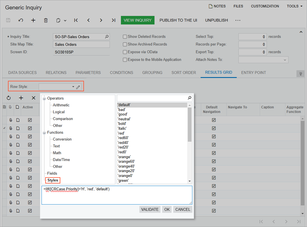 For example, suppose that you have an inquiry that lists open cases and shows the priority of each case in the Priority column, and that you would like to highlight with red the entire rows that display cases with a high priority. On the Results Grid tab of the Generic Inquiry form, you invoke the Formula Editor in the Row Style box (which is located in the Selection area of the tab). You use the IIf function for this purpose and compose the following formula: =IIf([CRCase.Priority]='H', 'red', 'default'). The system processes the formula as follows: If the value in the Priority column equals H, then highlight it with red; otherwise, use the default color (which is predefined and has no highlighting).