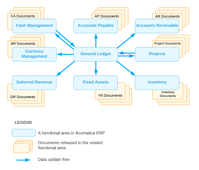 The general ledger is the central functional area of MYOB Acumatica, offering integration with other subledgers and functional areas and giving instant access to mission-critical financial data. You use the general ledger and its forms to perform a variety of procedures related to processing financial transactions, which are briefly described in the following sections of this topic.