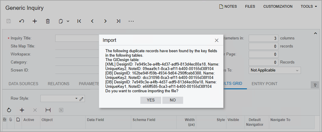 If multiple duplicate records are found, the system displays a warning about these records (see the following screenshot). If you click Yes in the Import dialog box, the system then processes the duplicate records based on the link type and attributes specified for the parent and child tables in the XML schema.