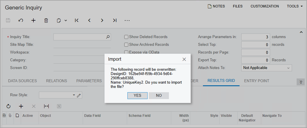 If only one record is found in a parent table, the system displays a warning that this record will be overwritten (see the following screenshot). If you confirm the operation, the system replaces the unique key of the existing record with the unique key of the imported record.
