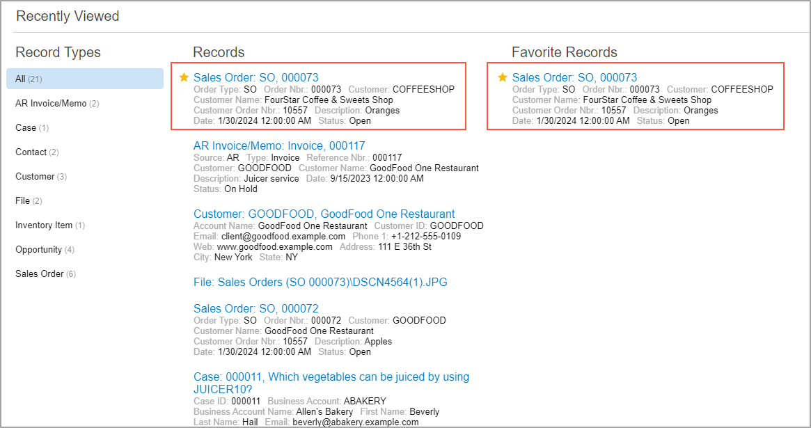 When you work with specific records—such as sales orders, invoices, or contacts—frequently, you can add them to Favorite Records in the Recently Viewed workspace. This will not remove them from the Records list. The record will be listed under both Records and Favorite Records, as shown in the following screenshot.