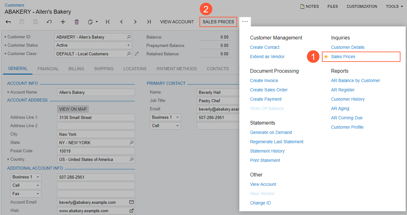 To designate a command as a favorite, you open the More menu, point at the needed command, and click the star icon that appears left of the command. The yellow color of the star indicates that the command has been added to your favorites, and a button for the command appears on the form toolbar immediately. The following example shows a command (Item 1 in the following screenshot) that has been added to the user's favorites on the Customers (AR303000) form and thus added as a button on the form toolbar (Item 2).