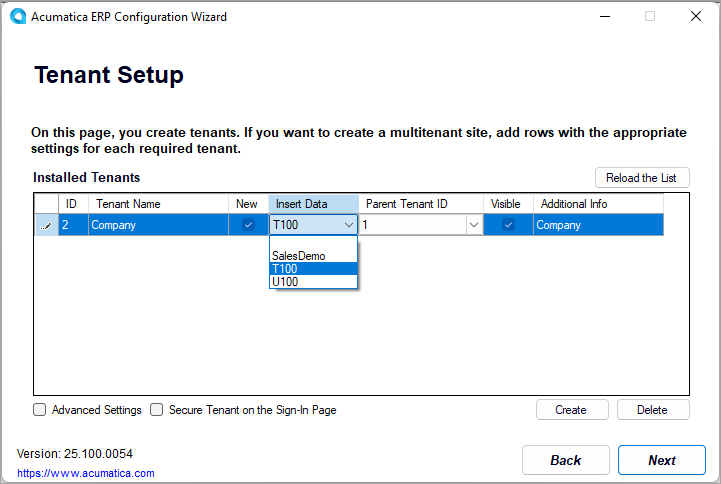 - Click the row with AcumaticaT100 instance, and then click