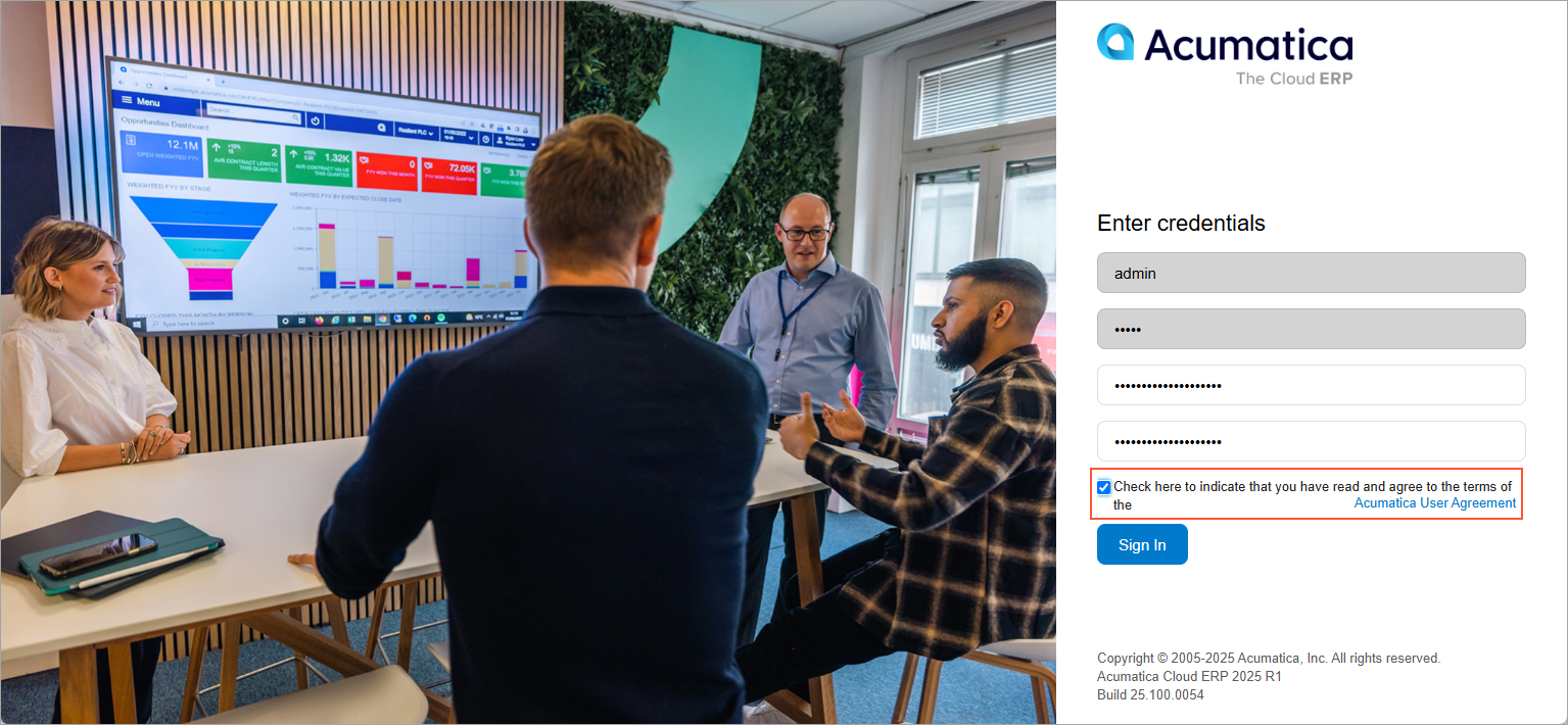 - Sign in to the MYOB Acumatica out-of-the-box instance for the first time
