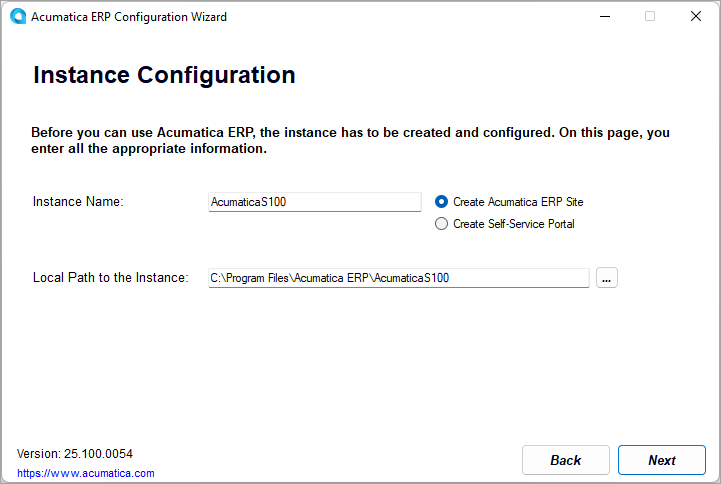 By default, this is the folder with the instance name, which is located in the folder where the MYOB Acumatica ERP Configuration Wizard has been installed. The path should have the following format: %Program Files%\Acumatica ERP\AcumaticaS100, as shown in the following screenshot.