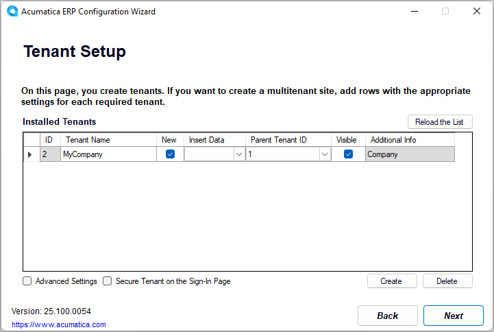 The Tenant Setup page opens. By default, the wizard creates a new tenant with no data preloaded and with the default name Company in the Tenant Name column. The name specified in this column is displayed on the Sign-in page of the application instance and in the instance’s user interface.