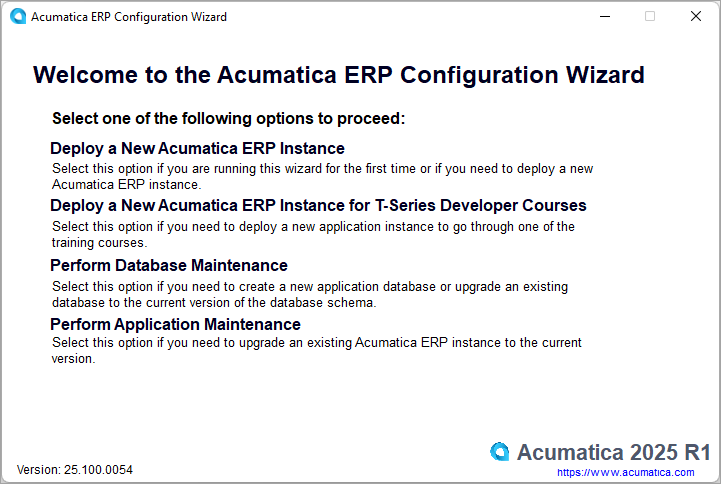 - While you are viewing the Welcome page of the MYOB Acumatica ERP Configuration Wizard, click Perform Application Maintenance.