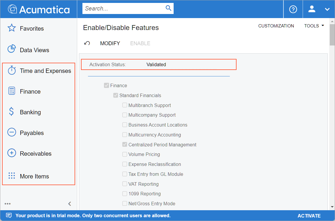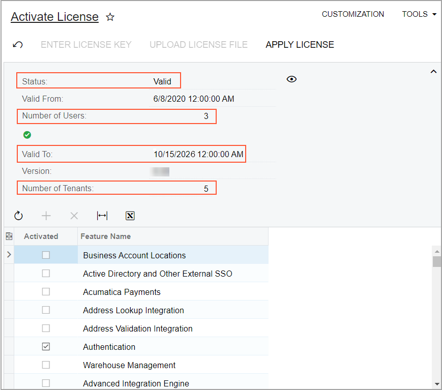 In the following activity, you will learn how to enable features in MYOB Acumatica, activate the license, and review the license information.
