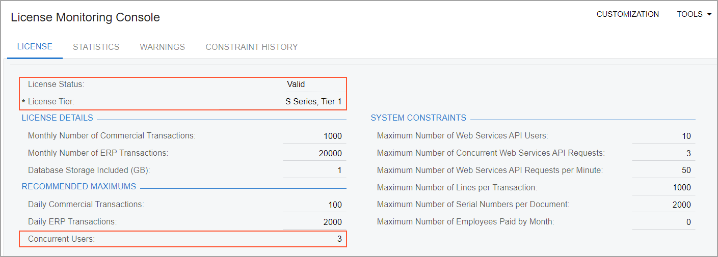 - In the Recommended Maximums section, notice that Concurrent Users is set to 3. This means that three users can work in the system at the same time.